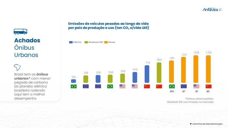 O estudo constatou que o ônibus urbano, abastecido com diesel, é o que emite menos carbono no mundo por causa da adição de 15% de biodiesel, trazendo vantagem competitiva para o Brasil. Abastecido com 100% de biodiesel, é a alternativa para descarbonização no país, com menos emissões que os elétricos que rodam na China e nos Estados Unidos.