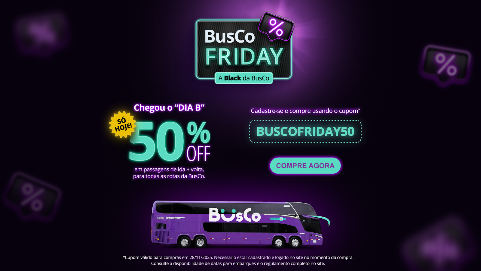 A BusCo – mobitech low cost – anuncia tarifas pela metade do preço na Black Friday, no dia 28 de novembro. Nesta data, os viajantes poderão garantir passagens com 50% de desconto ao aplicar o cupom BUSCOFRIDAY50, válido para todas as rotas.