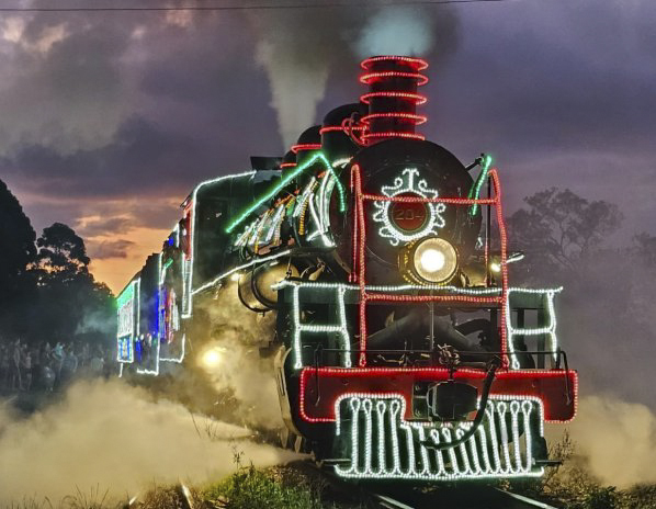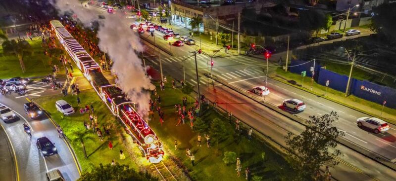 A Maria Fumaça Iluminada é uma locomotiva a vapor modelo Mallet 204, fabricada em 1950 e reconhecida por ser a única em operação na América do Sul. A bordo desse ícone ferroviário estará o Papai Noel, que vai acompanhar a passagem do trem pelos bairros da cidade.