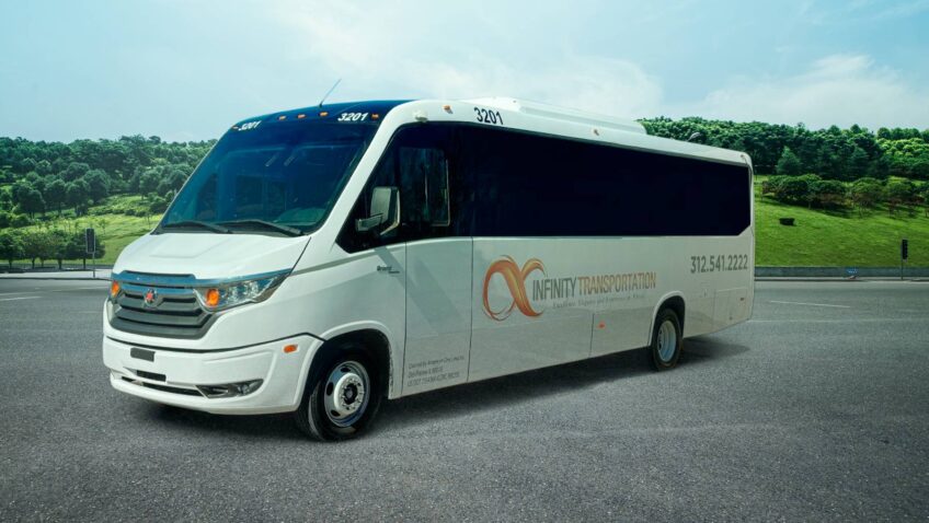 Com capacidade para 32 passageiros e montado sobre o chassi Ford F59, o Grand Executive se destaca no transporte da região de Chicago por ser um dos poucos no mercado de fretamento equipados com motorização a gasolina.