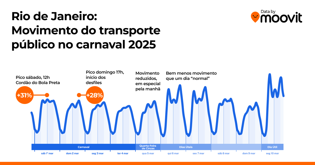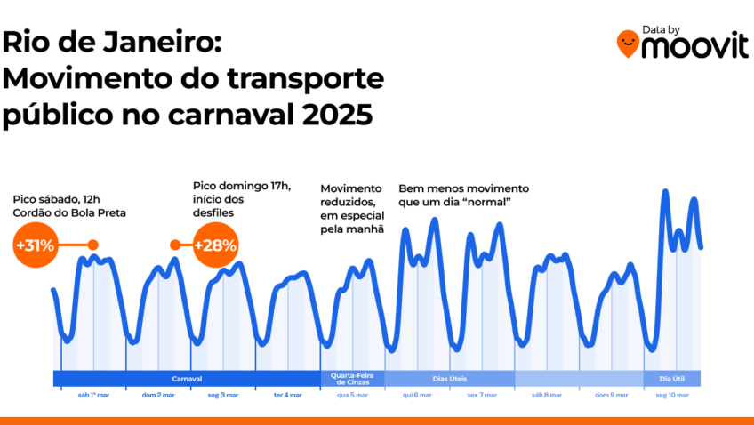 Como os foliões circulam de transporte público durante o carnaval? Como é o movimento durante a festa em comparação aos dias úteis? As perguntas podem ser respondidas ao analisar o uso do Moovit. A equipe de dados do app fez um levantamento com base na utilização do aplicativo ao longo do carnaval do ano passado.