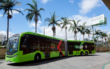 O modelo tem 21,5 metros de comprimento e capacidade para 146 passageiros, sendo equipado com o powertrain elétrico desenvolvido em parceria com a WEG