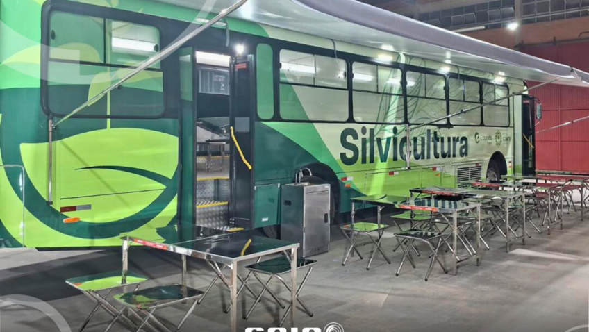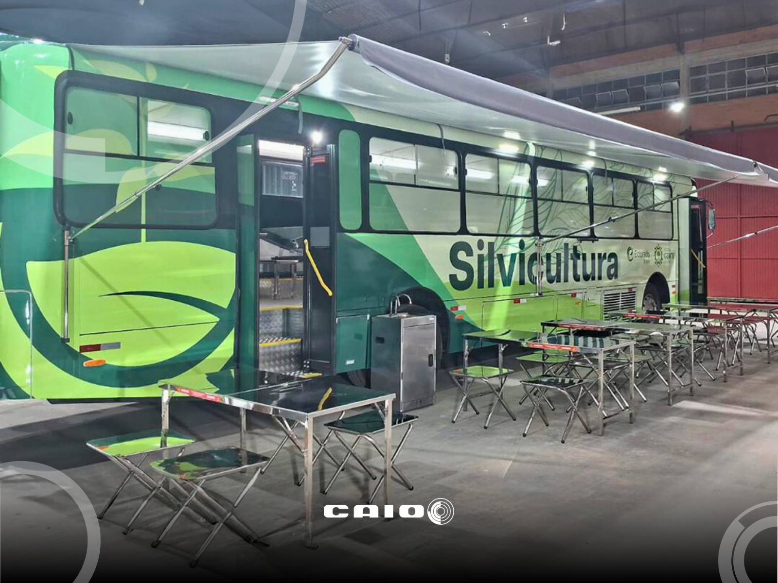 Para atender às necessidades do projeto Espaço de bem-estar florestal da Eldorado, a Caio adaptou o Apache Vip para receber a customização necessária, que inclui um refeitório com mesas e poltronas duplas, armário para armazenamento de marmitas, bebedouros, porta-televisores e, na área externa, toldos para proteção solar, mesas retráteis e lavatório duplo com acionamento no pedal e reservatório no bagageiro.
